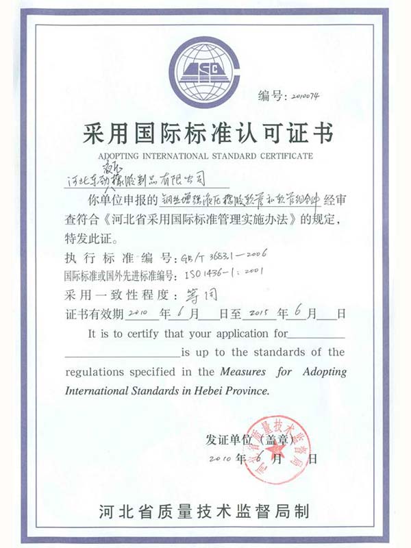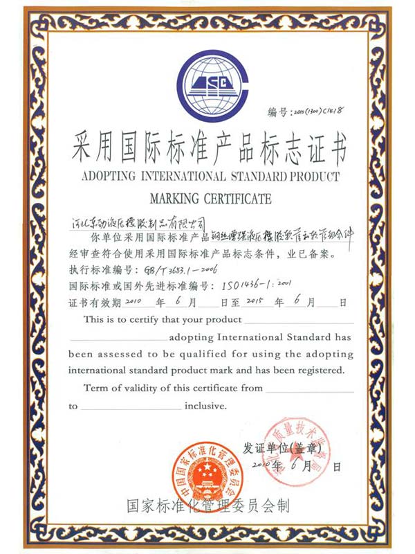 • 鋼編管?chē)?guó)際標(biāo)準(zhǔn)產(chǎn)品標(biāo)志證書(shū)